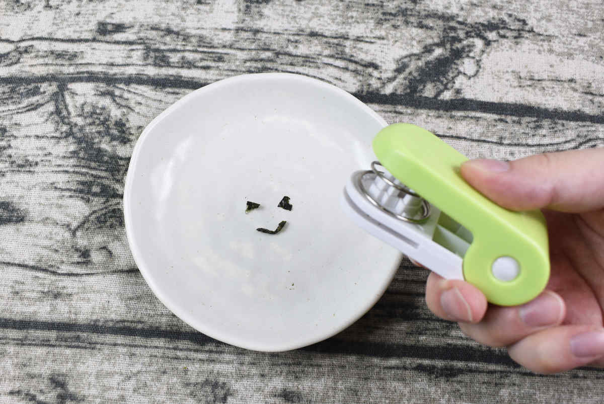 実際に海苔をパッチンに挟み、そのままホッチキスのようにパンチすると、ニコニコと笑っている海苔でできた顔文字が完成しました。