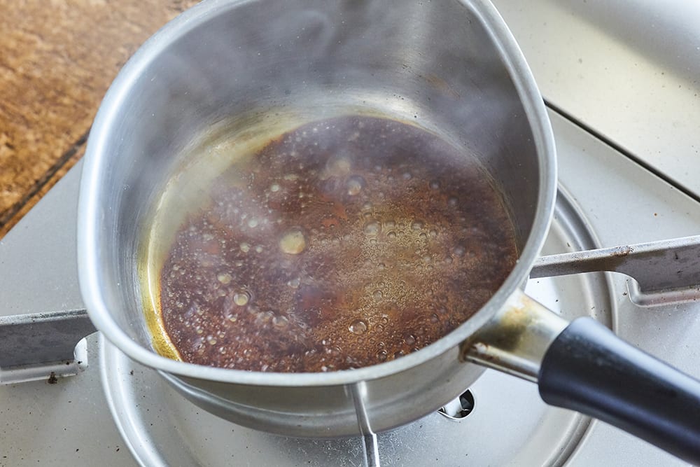 小鍋に砂糖、水大さじ1(分量外)を入れて中火にかける。砂糖が溶けて茶色く色づいてきたらときどき鍋を静かに回し、濃い醤油色になるまで加熱する。準備した型に等分に流し入れる。