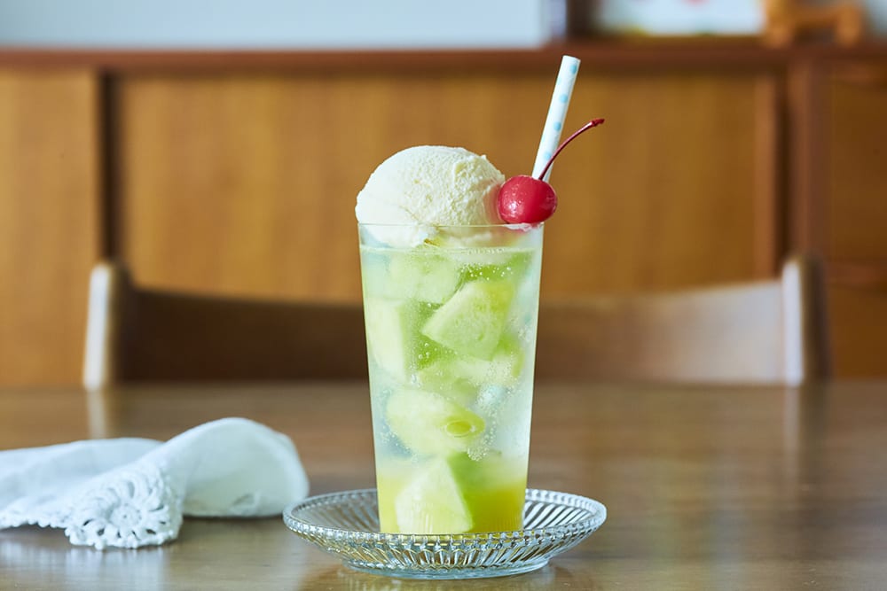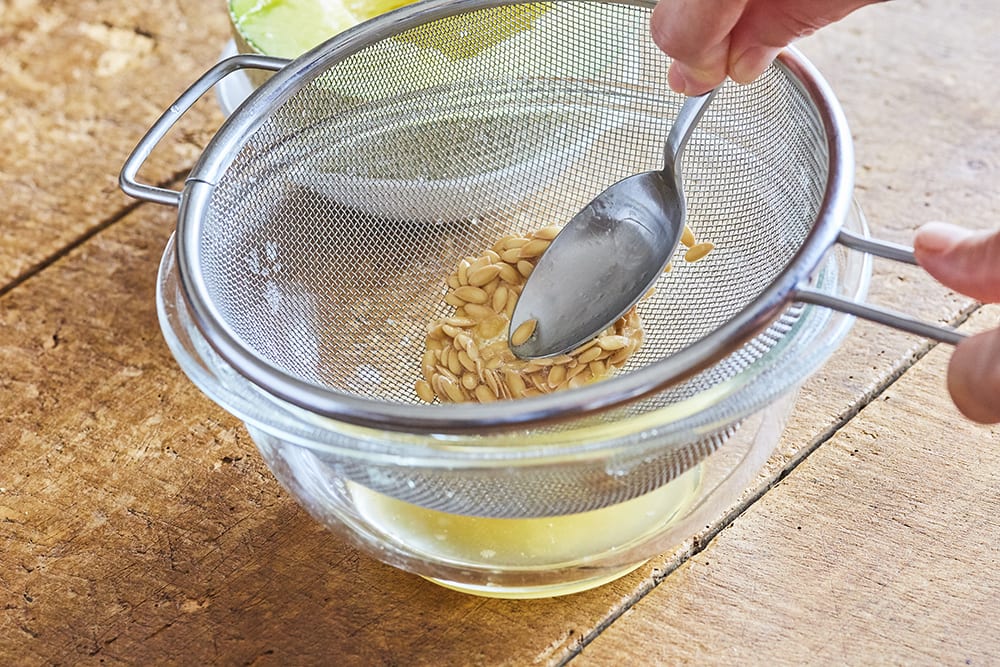 ボウルにざるをのせ、メロンの種をワタと果汁ごとくりぬいてざるに入れる。スプーンで種をこす。実は皮をむいて2㎝角に切る。