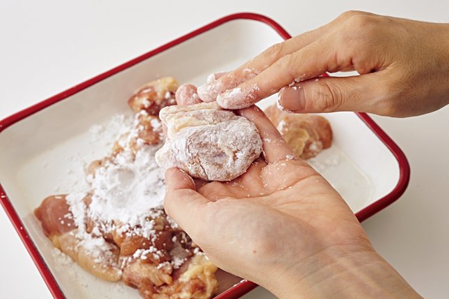 鶏肉は余分な脂と皮をとり除き、大きめのひと口大に切ってAに30分漬ける。キッチンペーパーで汁けをとり、片栗粉をまぶして余分な粉を払う。