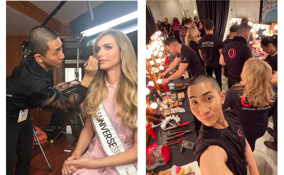 メイクアップアーティストとしてミス・ユニバースで活躍する西村さん。出場者にメイクを施す西村さん(左)、ミス・ユニバース2019のバックステージの様子(右)