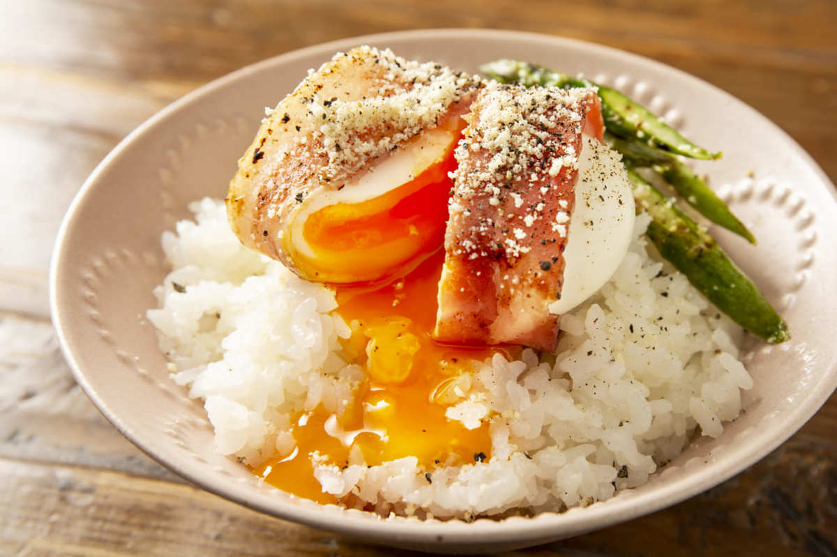 半熟卵のベーコン巻き丼レシピ「あぁ…見た瞬間にお腹が空くやつ」
