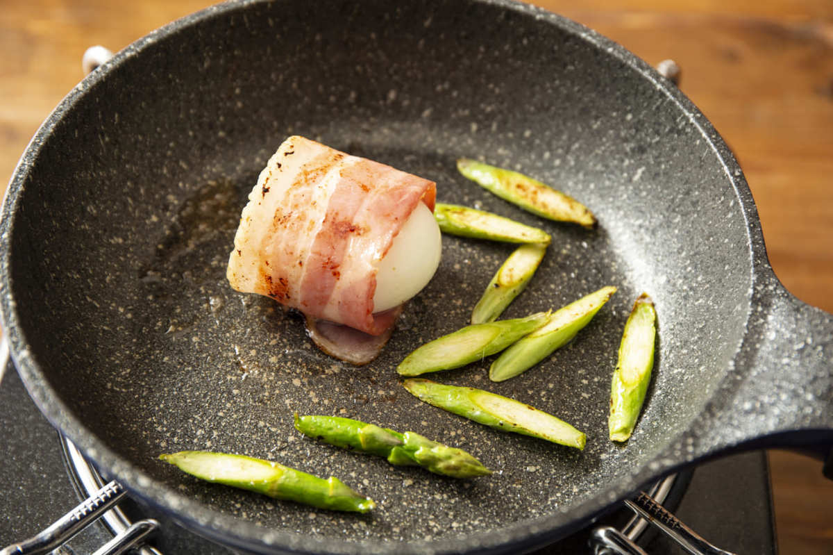 小さめのフライパンに①の巻き終わりを下にして入れ、②も入れて中火で熱する。ベーコンに焼き色がついてきたらそっとひっくり返す。グリーンアスパラは焦げるようなら先に取り出す。3〜4分ほど焼いてベーコン全体がこんがりしてきたら、ごはんを盛った器にのせ、アスパラも添える。黒こしょうと粉チーズをふる。