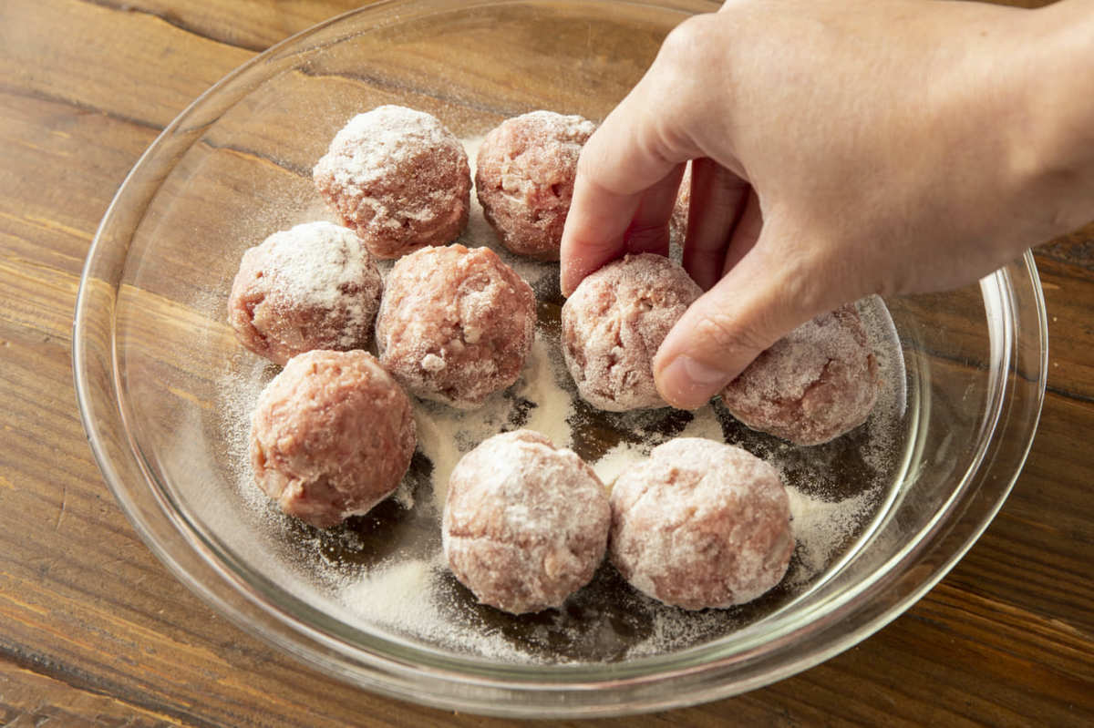 ボウルにAを入れて粘りが出るまで2分ほどしっかりと練る。玉ねぎとBを入れて混ぜ、10等分して丸める。小麦粉を薄くつける。