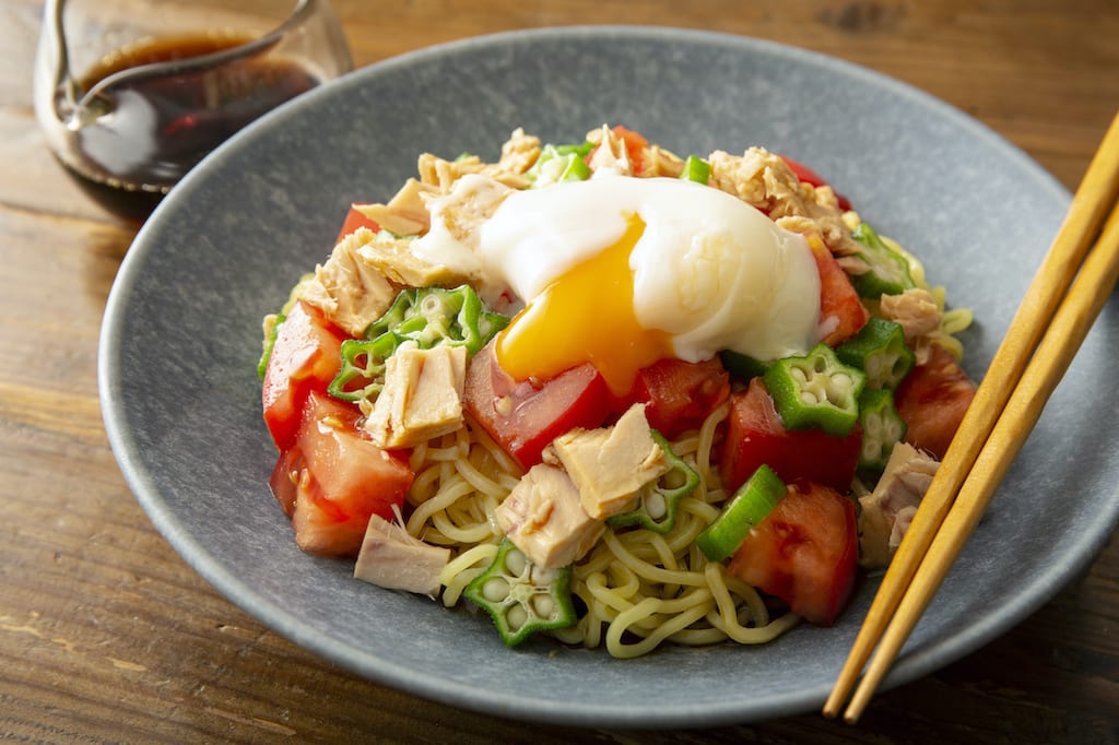 鍋にたっぷりの湯を沸かし、麺を袋の表示時間通り茹でる。残り2分でオクラを入れて一緒に茹で、ザルに上げてオクラは水にさらし、麺は流水の下で軽くもみ洗いする。それぞれしっかり冷えたら、麺は手で押さえるようにしてしっかり水きりする。オクラは小口切りにする。
