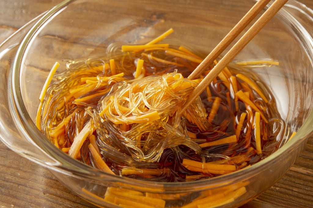 耐熱ボウルにAを混ぜ合わせ、春雨を加え、その上ににんじんをのせる。ふんわりとラップをし、電子レンジ600Wで5〜6分加熱する。ラップをはずして全体を混ぜ、15〜20分おく。