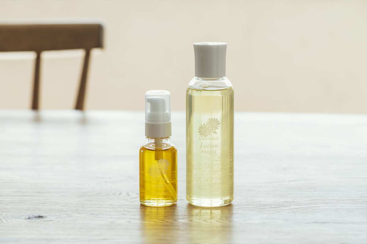 (右)カレンデュラ手づみローション 153ml 2970円、(左)カレンデュラ手づみオイル 32ml 2970円
