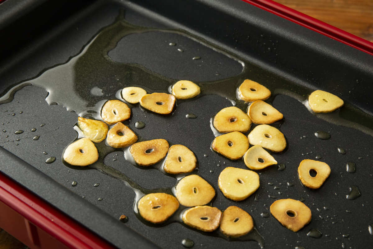 ホットプレートにオリーブオイルとにんにくを入れて低温にし、焦がさないように気をつけながらにんにくの両面をこんがり焼く。きれいな狐色になったら一度にんにくだけ取り出す。
