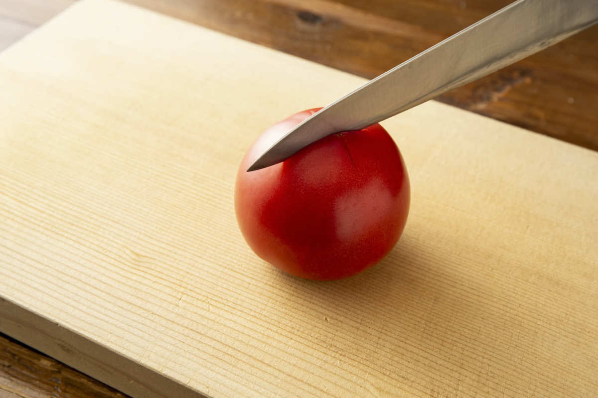 トマトはヘタを取り、十字に切り込みを入れる。とうもろこしは縦に置き、包丁を上から下に動かして削ぎ取るようにして芯から実をはずす。ベーコンは1cm角に切る。