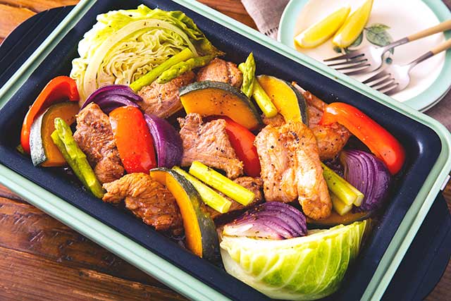 ホットプレートにオリーブオイル大さじ1/2を入れて高温にし、①を入れて両面を焼く。表面の色が変わったら真ん中に寄せ、両端にキャベツをおく。肉の上にレモン以外の切った野菜をバランスよく並べ、全体に塩・こしょうをしっかりめにふり、オリーブオイルをかける。ふたをして中温にし、15分ほど加熱する。肉に火が通ったらレモンを添える。