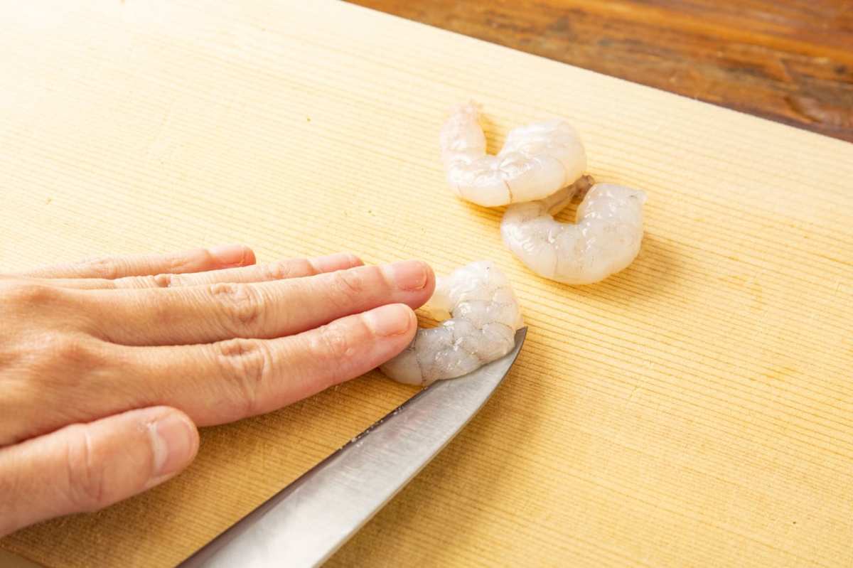 えびは背に切れ目を入れて背ワタを除く。鍋に湯を沸かし、2〜3分ゆでたら冷水にとり、水けをふく。