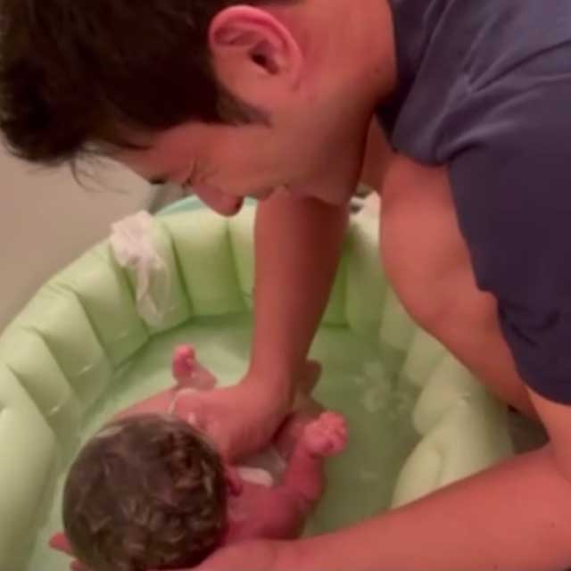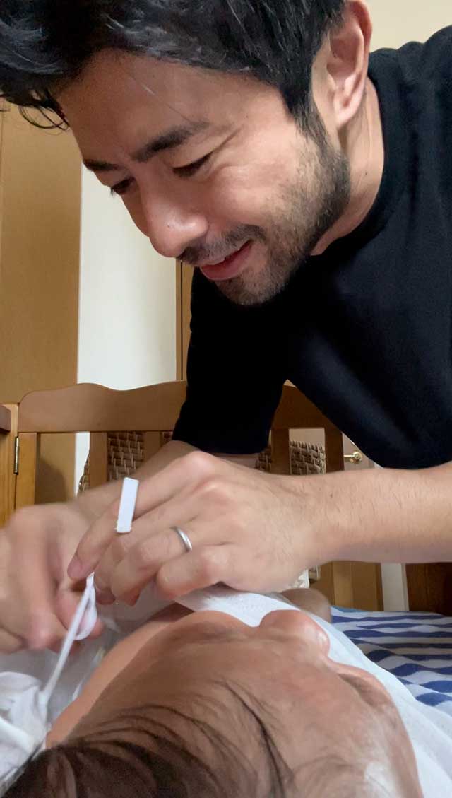 子どもの沐浴中の榎並アナ(写真提供/本人)