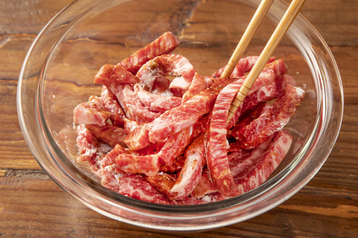 牛肉は1cmの棒状に切り、ボウルに入れてAをもみ込む。