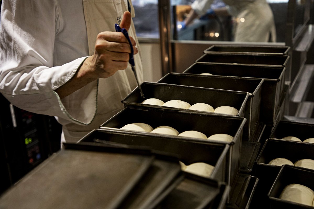 焼きあがったパンに気泡ができず美しい見た目になるように、ハサミでカットします