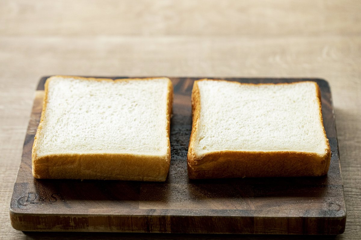 嵜本の食パンは、高さ3mmほど! 水分量が高く通常の2斤のパンの1.4倍ほどの重量があるそう