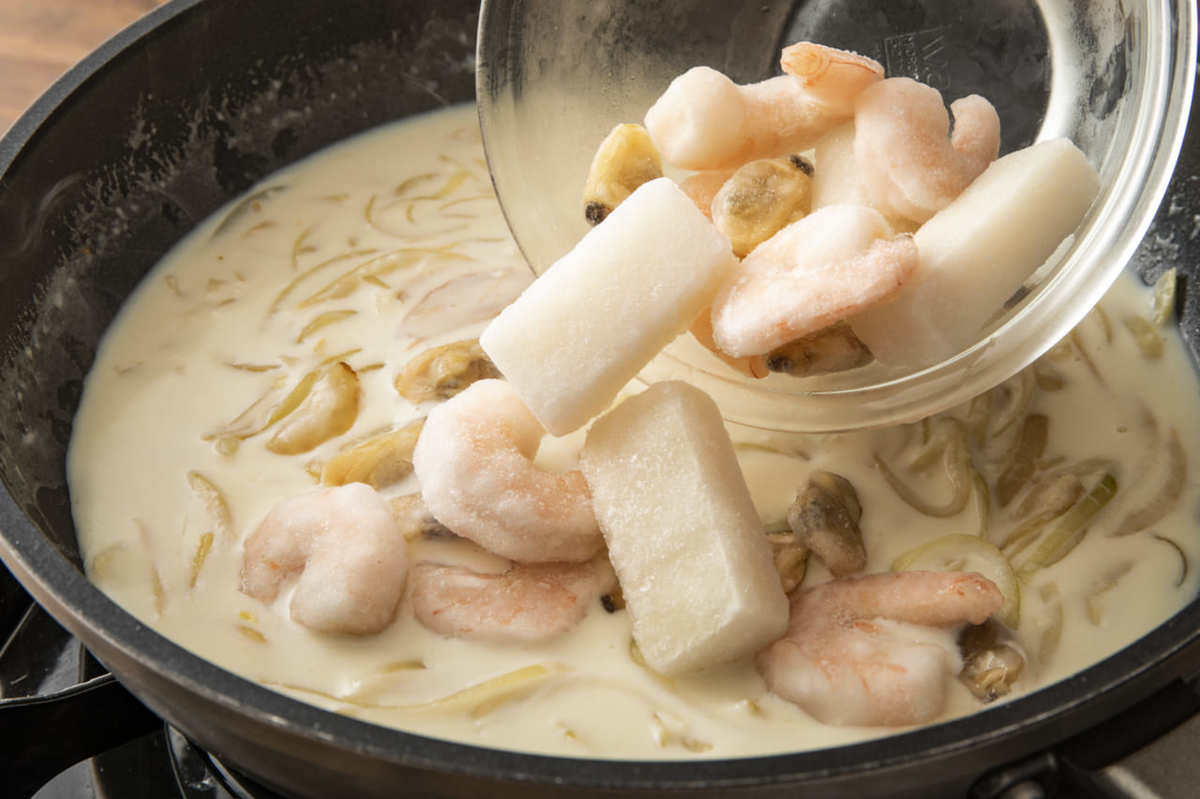 フライパンにバター10gを入れて中火で熱し、バターが溶けたら玉ねぎを入れて焦げないように注意しながら4〜5分ほど炒める。玉ねぎがしんなりしてきたら残りのバターを入れ、バターが溶けたら小麦粉を入れて混ぜる。粉っぽさがなくなってきたら牛乳を2〜3回に分けて入れ、その都度よく混ぜ合わせる。シーフードミックスを入れてフライパンのふちがフツフツしてきたら焦がさないように混ぜながら3〜4分煮る。
