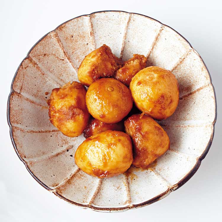 フライパンに調味料を入れて煮立て、里いもを加える。