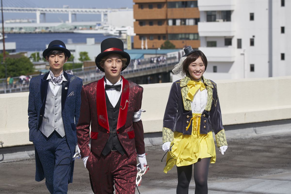 ▲左よりルパンブルー=宵町透真、ルパンレッド=夜野魁利、ルパンイエロー=早見初美花。ふだん、彼らが快盗として暗躍する際は仮面を装着しています。