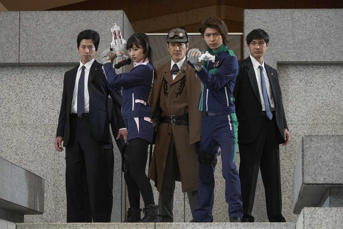 ▲イギリスからやって来た世界的な名探偵エルロック・ショルメをガードするパトレン2号=陽川咲也とパトレン3号=明神つかさ。
