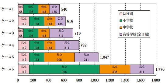 ※文科省が実施した「平成28年度・子供の学習費調査」より ※※保育園の場合は地域・収入差などでのばらつきが大きく、平成24年「地域児童福祉事業等調査」によれば、認可保育園の保育料で最も多いのは月額2~3万円。 一方で所得に応じて、月額1万円未満の家庭から、7万円以上かかる家庭も存在。