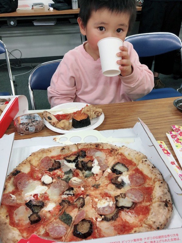 ▲ドラマのクランクアップの打ち上げにも参加した息子・晴太朗。パパの働く姿を見せられるのは嬉しい。それに、豪華なピザに大喜び!