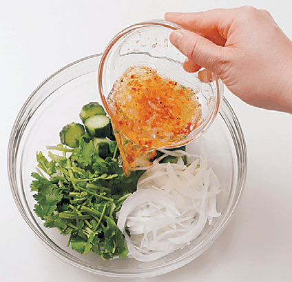 食べる直前に野菜にAを加えて混ぜ、器に盛る