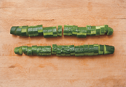 きゅうりは皮を縞目にむき、1 ㎝厚さの輪切りにする。パクチーは3~4㎝長さに切る。玉ねぎを薄切りにし、サッと水にさらす。桜えびは粗みじんに切る。にんにくは、すりおろす。