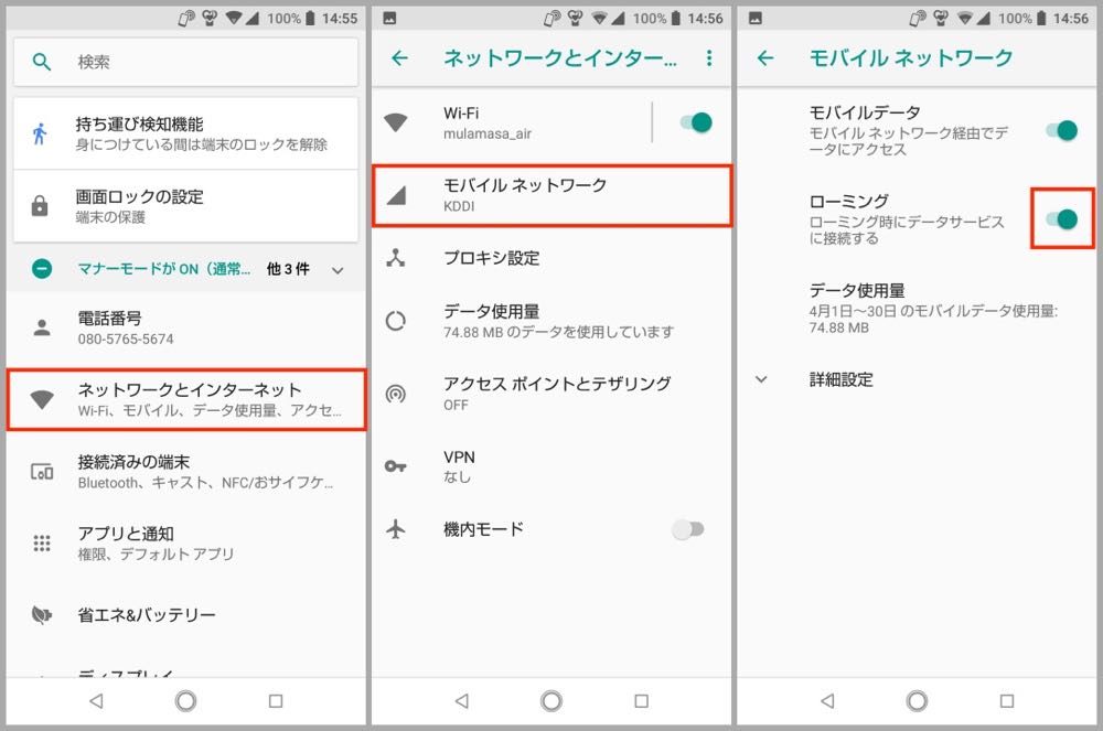 ▲Androidスマホの場合は「設定」アプリを開き、「ネットワークとインターネット」→「モバイルネットワーク」の順にタップし「ローミング」をオン