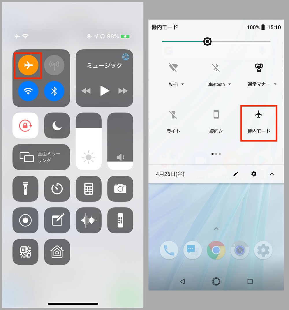 ▲iPhoneの場合は、コントロールパネルを表示して、飛行機のアイコンをタップ(写真=左)