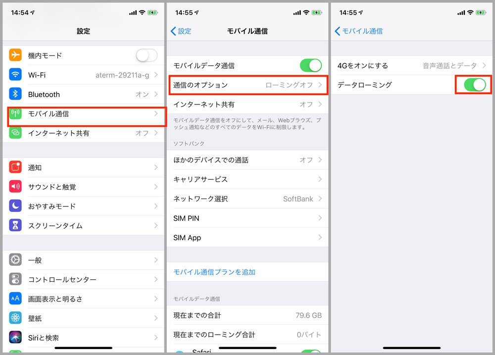 ▲iPhoneでは「設定」アプリを開き、「モバイル通信」→「通信のオプション」の順にタップし、「データローミング」をオフに